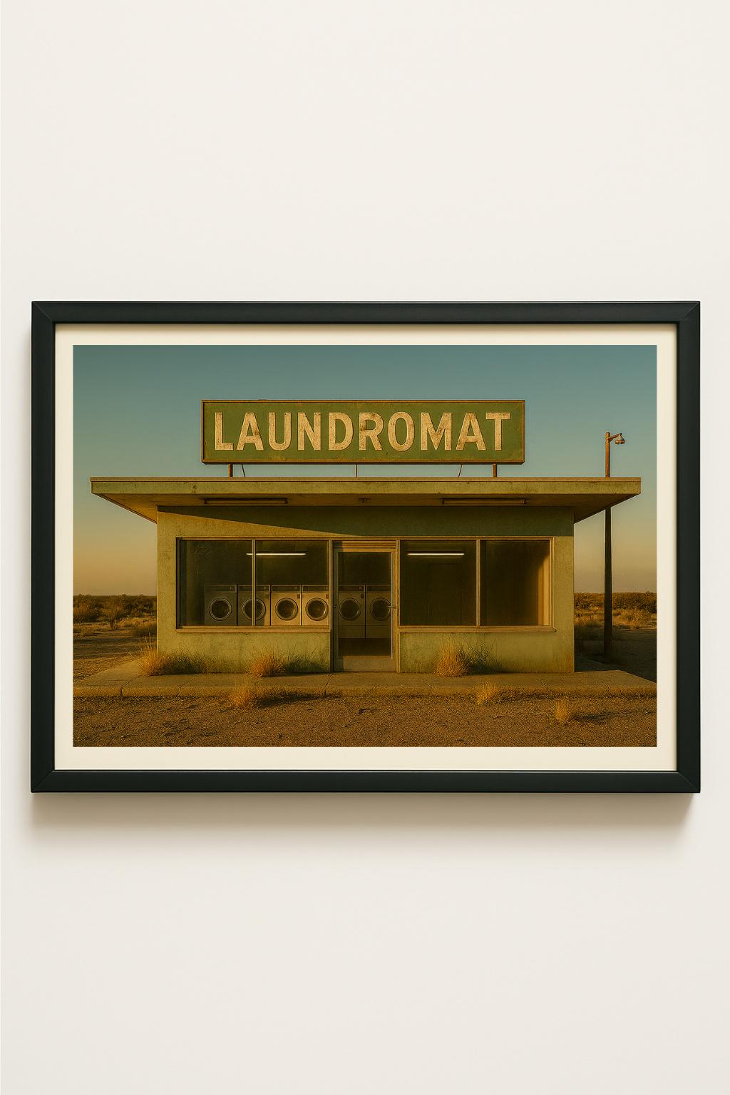 “Desert Laundromat” captures a haunting stillness beneath the fading light of dusk — a solitary building standing as a relic of roadside America. The muted green façade, weathered sign, and worn machines hint at decades of quiet decay, while the vast emptiness beyond the glass evokes the solitude of the open desert. A study in nostalgia and silence, this piece reflects both the endurance and fragility of forgotten places.
