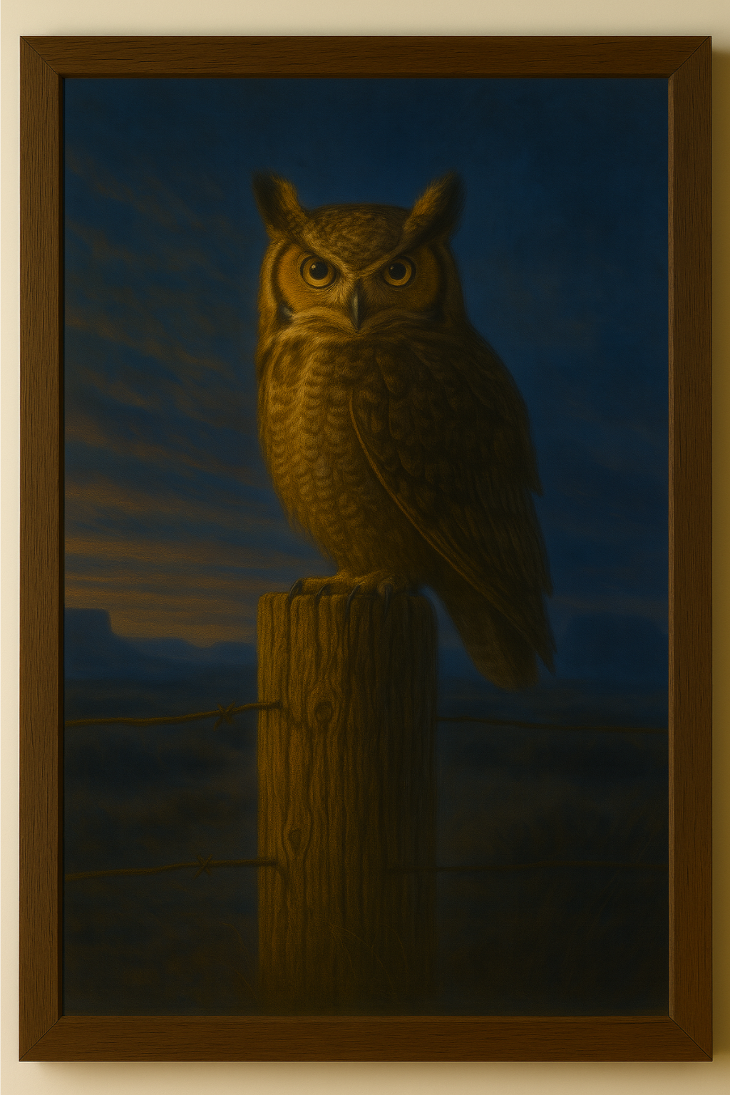As daylight fades beyond the mesas, a great horned owl takes its silent post — watchful, steady, and eternal. Keeper of the Dusk captures the stillness of twilight in the desert, where every shadow deepens and every sound softens.