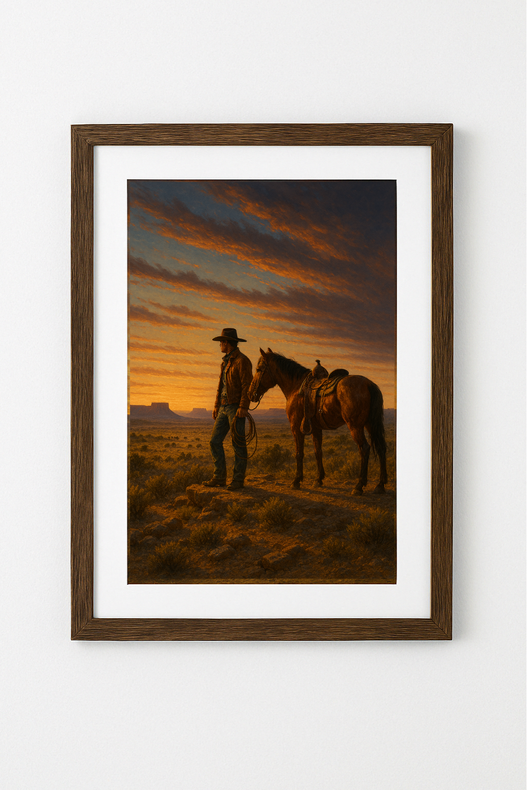 As the last light drapes the land in gold, a cowboy and his horse pause at the edge of the mesa, surveying the vast silence of the open West. "Long Way Home" captures that sacred stillness — the kind only found after miles of dust, dusk, and solitude. From the coiled rope in hand to the warm light on the worn saddle, every detail honors the grit, pride, and quiet beauty of life on the range. A timeless tribute to the soul of the American frontier.